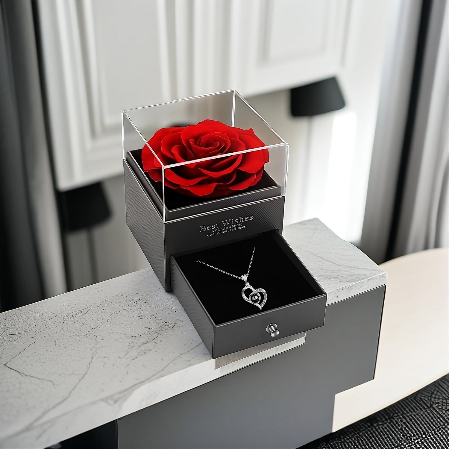 A timeless expression of love and elegance. This exquisite gift unites preserved rose - symbol of everlasting beauty - with a delicate heart-shaped pendant that speaks from the soul. Encased in a refined black box, each detail whispers affection and sophistication, making it the perfect gesture to celebrate her uniqueness and grace.